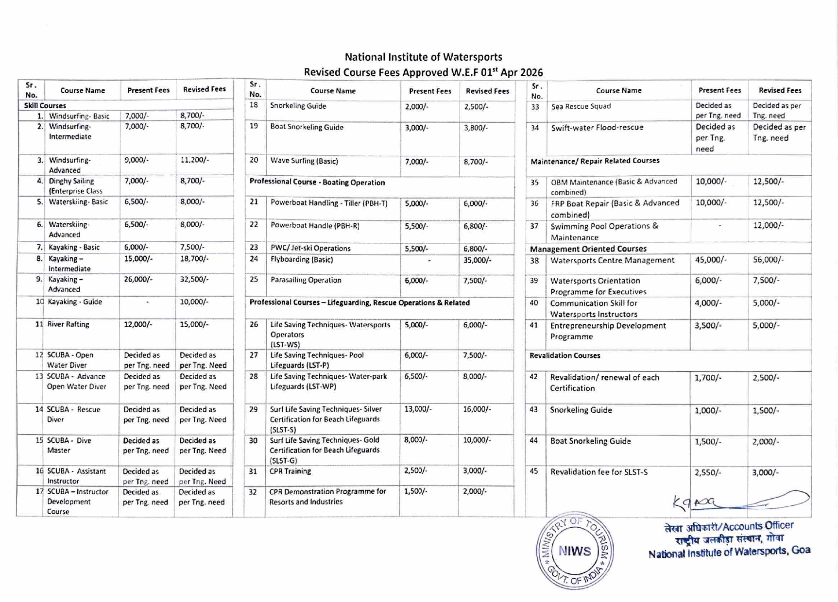 The course fees is worked out keeping in view the cost involved in conducting the courses in smaller batch of 12-15 persons. Course Fees w.e.f JULY 2018 is provided below :